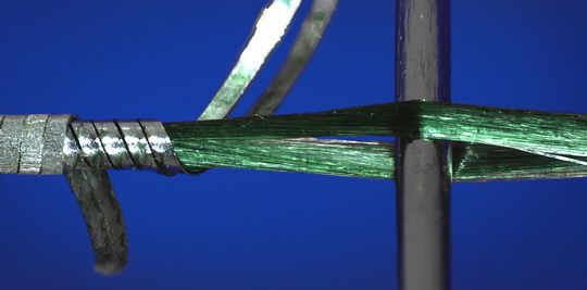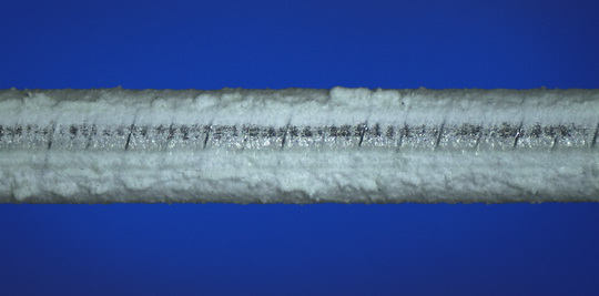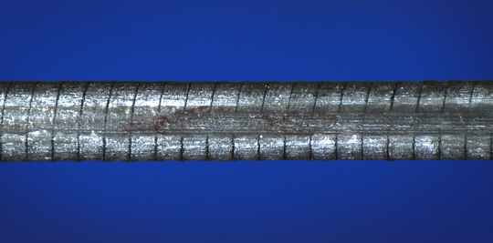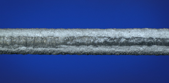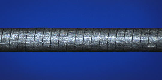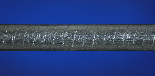 Some people suggest cleaning strings using the finest grade steel wool. We have rubbed this violin string with .000 steel wool for one minute. For a single clean a few seconds may be enough, but one minute of cleaning time can be accumulated over a short period of time. The steel wool has removed 10 – 15 microns (0,010 – 0,015 mm) of the string's mass. If we were to reduce the entire string length in such way, the tension of this violin string would decrease by about 1 – 1.5 Newton, which equals about 0.1 to 0.15 kg difference. It isn't very much, but if the reduction is in just one spot the string can become unstable and out of tune.