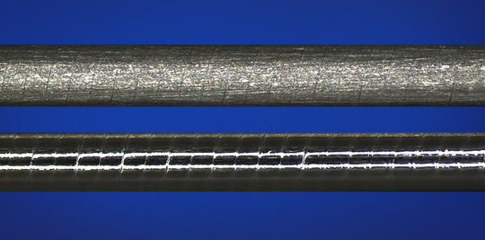 Not only that; cleaning with steel wool changes the surface structure a lot. It opens the winding gaps further and polishes the string winding to a perfectly shiny surface. This affects both the playability and the response. In the picture you can see the changed surface structure of the string that has been polished with steel wool.