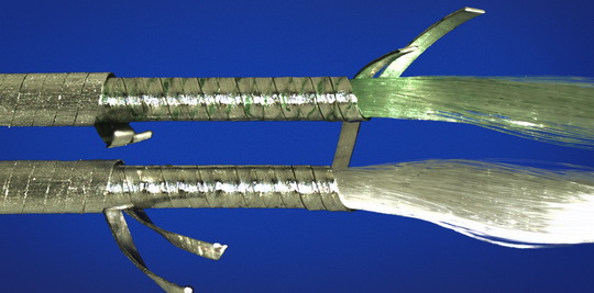 Comparison of the polluted string with a clean string. Just this one single cleaning action sees the thinned rosin penetrate not only between the two winding layers but also into the entire fibre core. Cleaning strings with alcohol is possible but we do not recommend this method if you want to maintain your string's sound quality for as long as possible.
